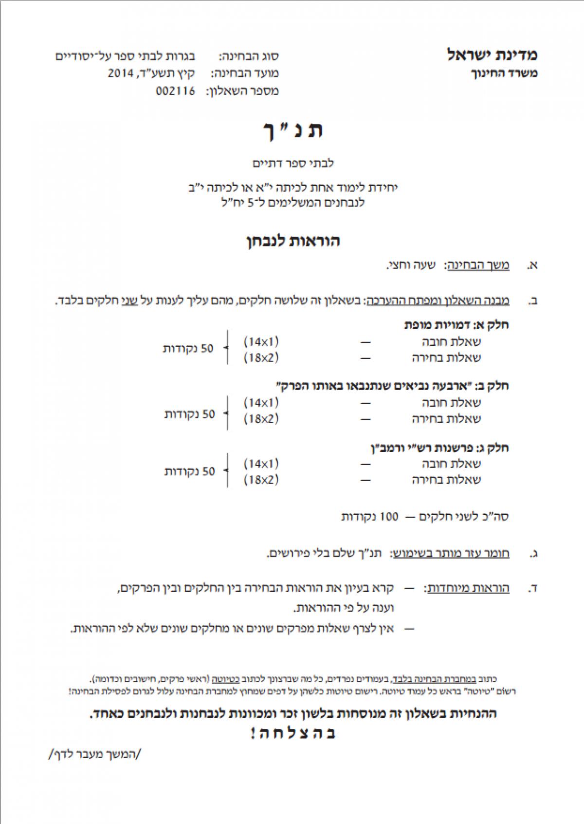 בכבוד רב,תלמידי כיתות יא הנבחנים ברמת חמש יחידות לימוד בתנ"ך