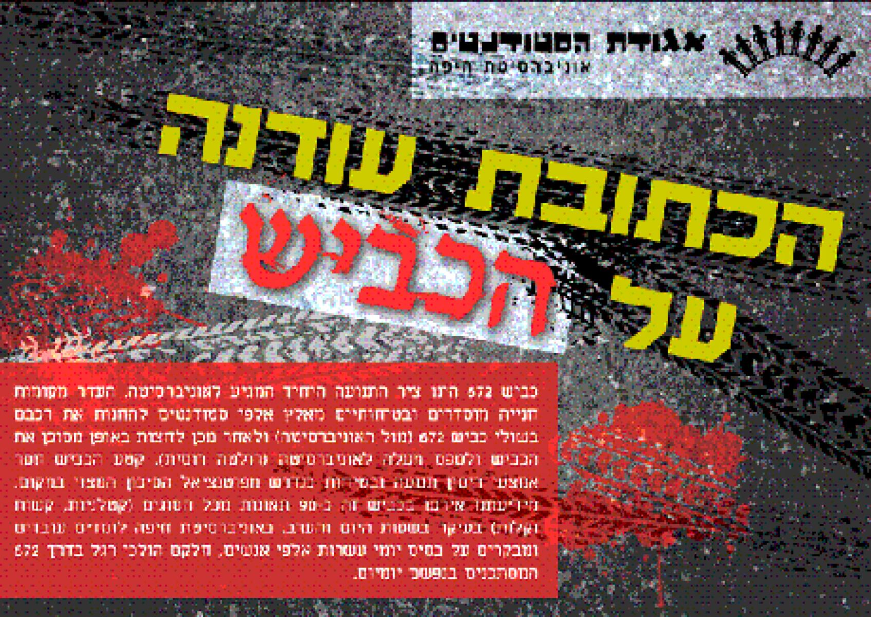 בשבועות האחרונים הזמנו אתכם להשתתף בהפגנה ולמחות יחד איתנו על בעיית הגישה לאוניברסיטה. לאחר שאיימנו בהשבתת לימודים ובחסימת הכביש המדובר, קיבלנו הבוקר אישור על בניית גשר המעבר להולכי רגל וכן על הסכם התקציב לבנייתו: מליון שקלים מעיריית חיפה, מליון שקלים מאוניברסיטת חיפה ומליון שקלים שתשקיע האגודה. האגודה תקבל את זכויות הפרסום על הגשר - דבר שיאפשר מימון חלקה של האגודה. אנו רואים בהשקעה זו חשיבות עליונה שכן בראש ובראשונה אנו דואגים לביטחון הסטודנטים ולשלומם. בעקבות האישור מהעירייה בוטלה ההפגנה שתוכננה והלימודים התקיימו כרגיל.---------------------------------------------------------------------כביש 672 הינו ציר התנועה היחיד המוביל לאוניברסיטת חיפה. העדר מקומות חנייהמוסדרים ובטיחותיים מאלץ מעל אלף סטודנטים להחנות את רכבם בשולי כביש672 (מול האוניברסיטה) ולאחר מכן לחצות באופן מסוכן את הכביש ולטפסמעלה לאוניברסיטה (מעין רולטה רוסית). קטע הכביש חסר אמצעי ריסון תנועהובטיחות כנדרש מפוטנציאל הסיכון המצוי במקום. מידיעתנו אירעו בכביש זהכ 90- תאונות מכל הסוגים (קטלניות, קשות וקלות) הן בשעות היום והן בשעות הערב.באוניברסיטת חיפה לומדים מעל 18,000 סטודנטים ובנוסף אליהם עובדים ומבקרים על בסיס יומי אלפיאנשים נוספים, חלקם הגדול נאלצים לחצות את מקטע כביש 672 ובכך מסכנים את נפשם יומיום.אגודת הסטודנטים של אוניברסיטת חיפה קוראת לרשויות האוניברסיטה, מע"צ ועיריית חיפה לקחת אחריות על חיי הסטודנטים, העובדים והמבקרים במקום. אנו דורשים להמציא, באופן מידי, אמצעי חציה בטיחותי שיאפשר גישה אל חניה מוסדרת וממנה, אשר לא יהווה סיכון לחיי אדם. המטרה היא להגיע לכמה שיותר חתימות, לכן כל חתימה חשובה!!!הצעות, הארות והערות יתקבלו בברכה!להצטרפות לקבוצת המאבק בפייסבוק http://www.facebook.com/groups/223256474441901/