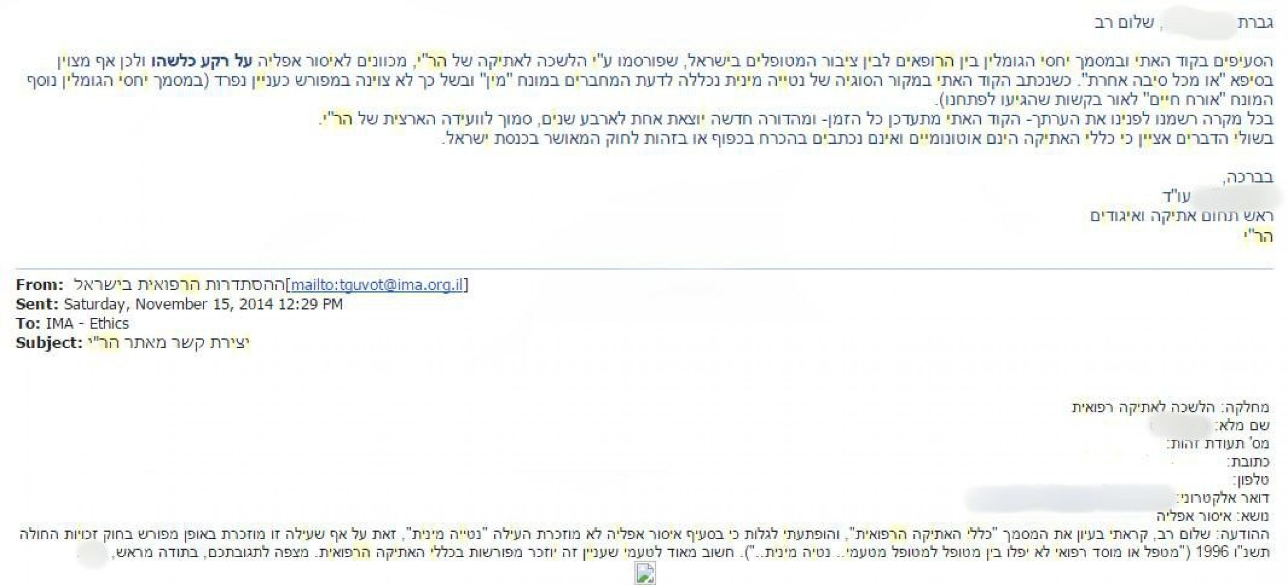 אם סעיף המורה על איסור אפליה קיים בקוד האתי של הר"י, מן ההכרח שיוזכר בו איסור אפליה על בסיס נטיה מינית, כפי שמוזכרים בו איסורים חשובים לא פחות כמו אלה העוסקים באפליה על בסיס לאום ומעמד כלכלי, וזאת במיוחד לאור העובדה שאיסור על אפליה על בסיס נטיה מינית כתובה במפורש בחוק זכויות החולה: "...מטפל או מוסד רפואי לא יפלו בין מטופל למטופל מטעמי... נטיה מינית...". בישראל של שנת 2014 אין שום סיבה נראית לעין בה איזשהו מעסיק פרטי או ממסד ציבורי יראה לנכון לא לספק שירות בסיסי לאדם על סמך הבדל תרבותי או חברתי כלשהו.