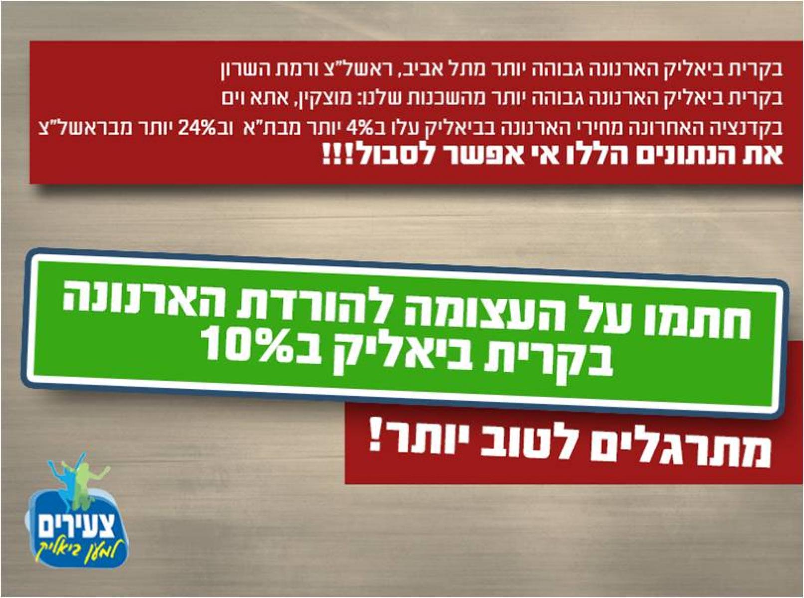 תושבים יקרים,נחנקנו !!* קרית ביאליק היא עיר עם הכנסות מהגבוהות באיזור.* לקרית ביאליק יש תקציב שגדול ב20% משכנתה - קרית מוצקין.* וקרית ביאליק היא בין 10 הערים הראשונות בארץ עם הארנונה הגבוהה ביותר. חתמו על עצומה להורדת הארנונה ב10% לפי מתווה עירית ראשון לציון שהורידה את הארנונה ב6% בשלוש השנים האחרונות.