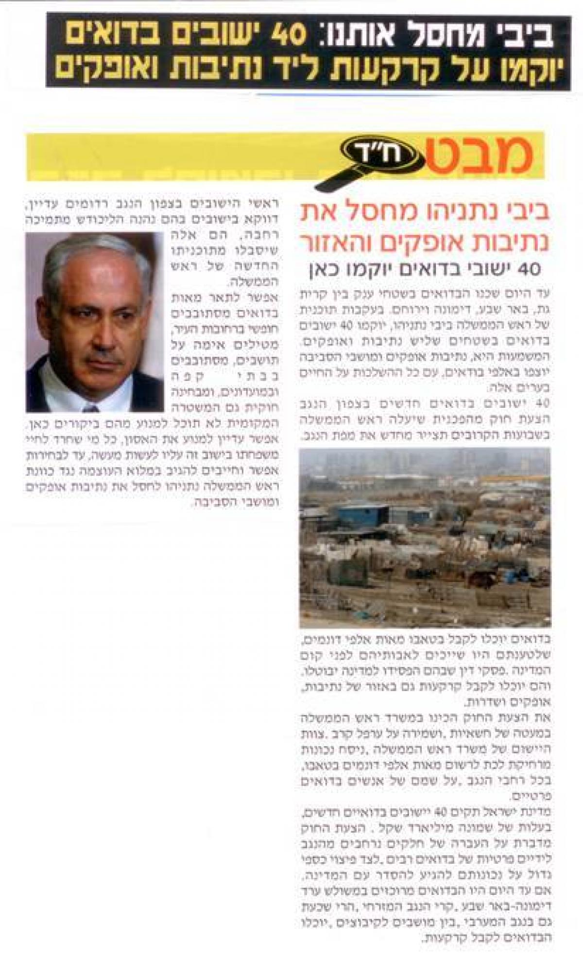 לא ניתן ל 40 ישובים בדואים לקום על הקרקעות באזורים של נתיבות, אופקים ושדרות