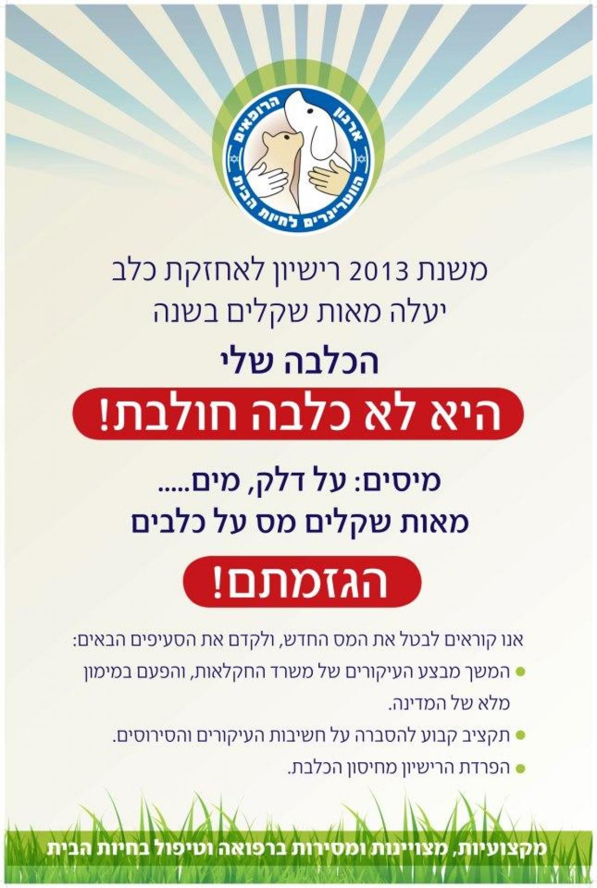 משנת 2013 רישיון לאחזקת כלב יעלה מאות שקלים בשנההכלבה שלי היא לא כלבה חולבתאני החתום מטה מבקש מממשלת ישראל ומכנסת ישראל, ובמיוחד מחברי הכנסת איתןכבל, פאינה קירשנבאום, דב חנין, רונית תירוש וניצן הורוביץ, לבטל את החוק המעלה אתאגרת אחזקת הכלבים הלא מעוקרים/ מסורסים למאות שקלים בשנה.במקביל- המשך מבצע העיקורים של משרד החקלאות בכול מרפאה וטרינרית בישראלובמימון מלא של המדינה.- תקציב קבוע להסברה על חשיבות העיקורים והסירוסים.- הפרדת הרישיון מחיסון הכלבת.