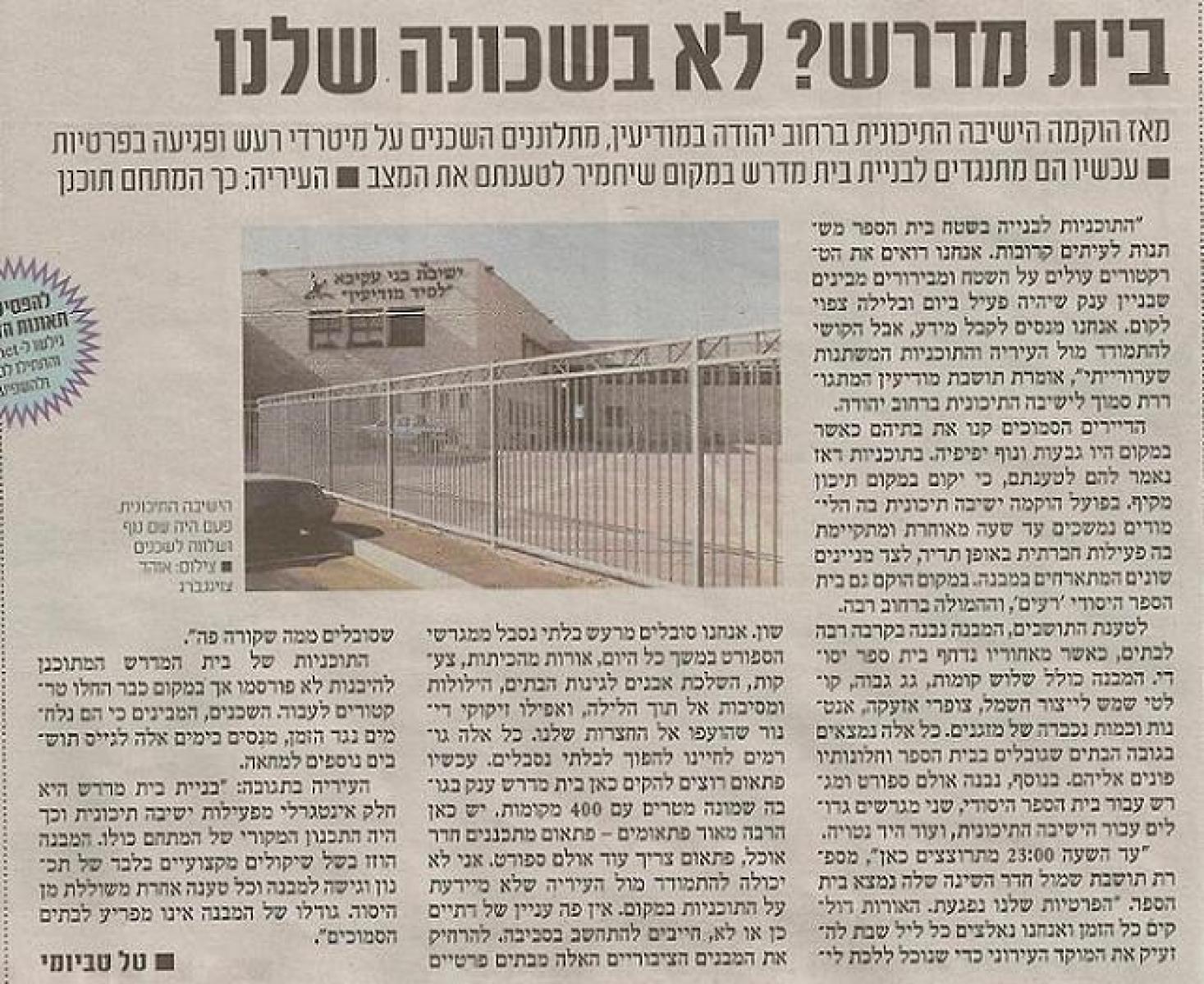 התנגדות להקמת בית מדרש אולם ספורט וחדר אוכל במגרש צ-6 שכונת שבטים במודיעין
