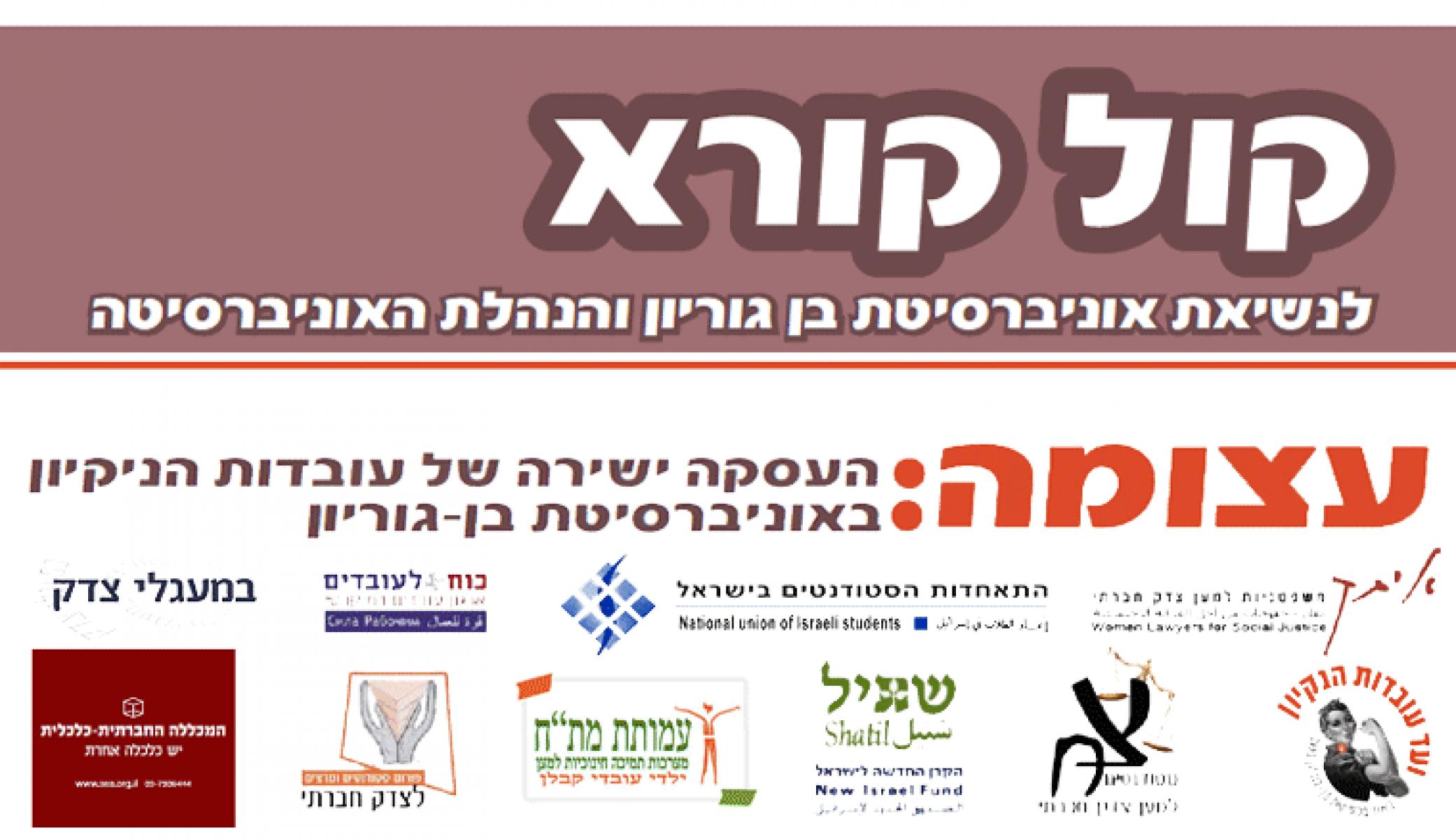כבוד הנשיאה, פרופ' רבקה כרמי, אנו פונים אליך כי תשימי סוף לפוגענות ובכך תהפכי את אוניברסיטת בן-גוריון למגדלור ולנושאת הדגל אשר החברה הישראלית זקוקה לו נואשות. נעמוד לצדך במאבק, אך לא נמשיך לשתוק ולעמוד מן הצד בעוד זכויותיהם של עובדי הקבלן נשים גברים וילדים, נרמסים בקרבנו בעודם מנקים אחרינו.