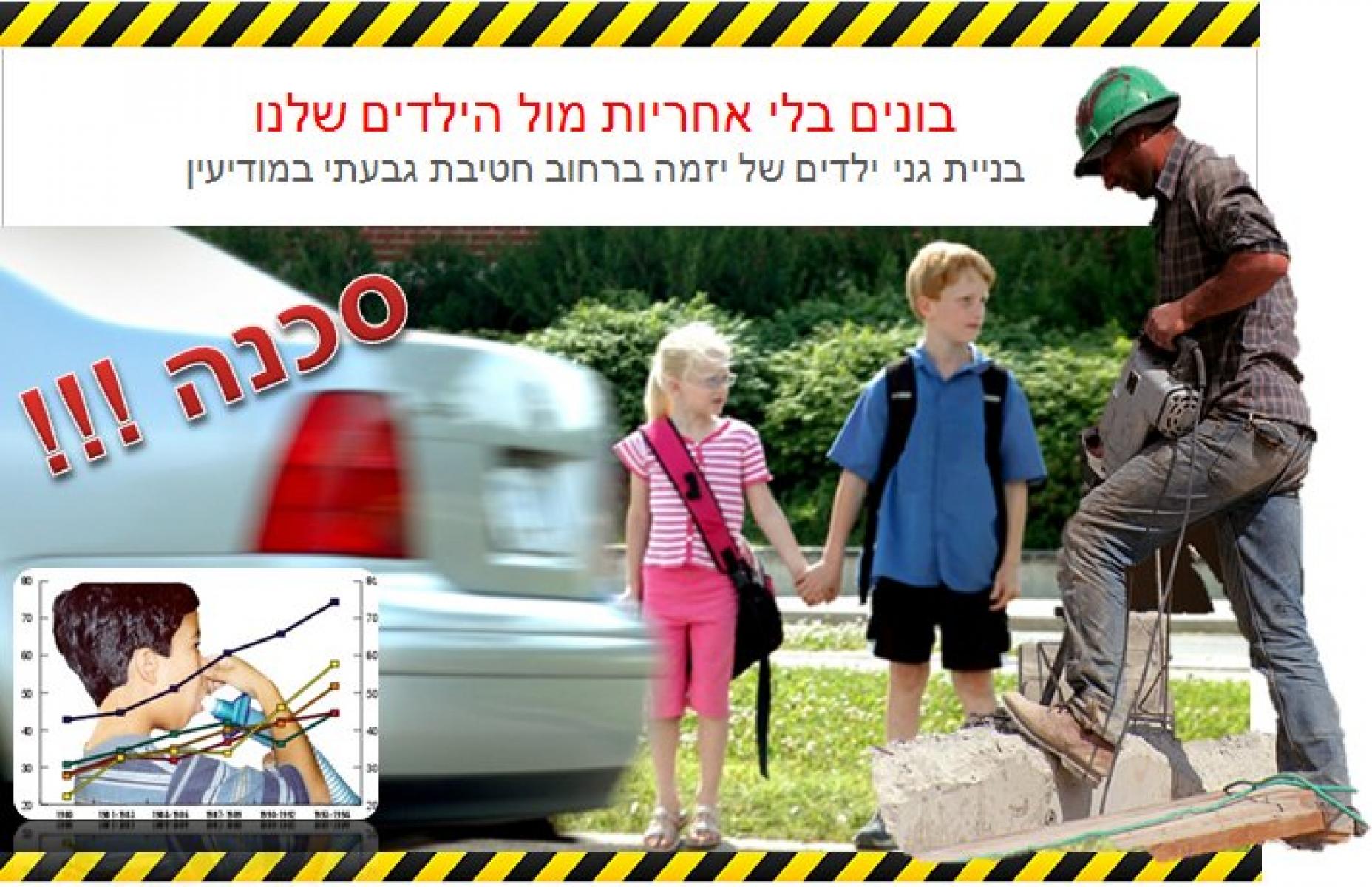 כפי שאנו רואים ושומעים, בימים אלה החלו עבודות הבנייה של עמותת יזמ"ה לבניית גני ילדים בשטח הפתוח ברחוב חטיבת גבעתי. על פי התוכניות שבמדור מידע תכנוני ורישוי תושבים אמורים להיבנות במקום 4 גני ילדים! מעברו האחד של בית הכנסת וחניה מעברו השני של בית הכנסת. אנו, תושבי השכונה, מודאגים מאוד מפגיעה משמעותית באיכות החיים שלנו, פגיעה סביבתית של פיח מתמיד, של מחסור בחניה, של מפגע בטיחותי וסכנת נפשות בהפיכת רחוב עורפי ושקט לרחוב ראשי וסואן. מדובר בכ-120 ילדים שיגיעו מידי בוקר לגנים אלו, קרי, כ-120 כלי רכב שיכנסו לרחוב בכל בוקר ואחה"צ על מנת להביא ולאסוף את הילדים מהגנים (מלפני 7 בבוקר ועד לאחר 5 אחה"צ). הוסיפי למתכון את 3 גני העירייה שבמורד הרחוב, המכילים כ- 100 ילדים נוספים ואת ביה"ס ממ"ד אבני חושן ואין צורך להכביר במילים ולתאר את מה שאנו עתידים לו...