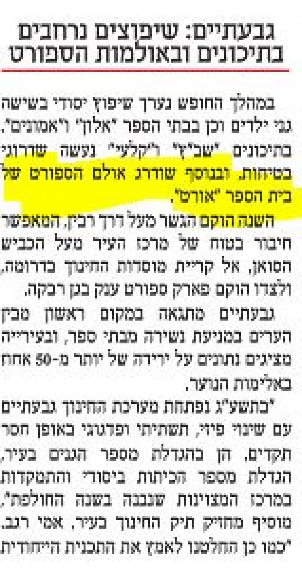זמן קצר לאחר מכן, בכתבה נוספת שהתפרסמה במקומון (במסגרת פרסום רשימת שיפוצים ושדרוגים שעשתה העיריה כחלק מתוכנית החומש והערכות לשנת הלימודים – הכתבה מצ"ב) צוין שגם אולם הספורט באורט גבעתיים שודרג. בפועל, לאחרונה בוצע תיקון קוסמטי בלבד באולם אורט (צביעה חלקית של קירות האולם. ר' תמונה מצ"ב).