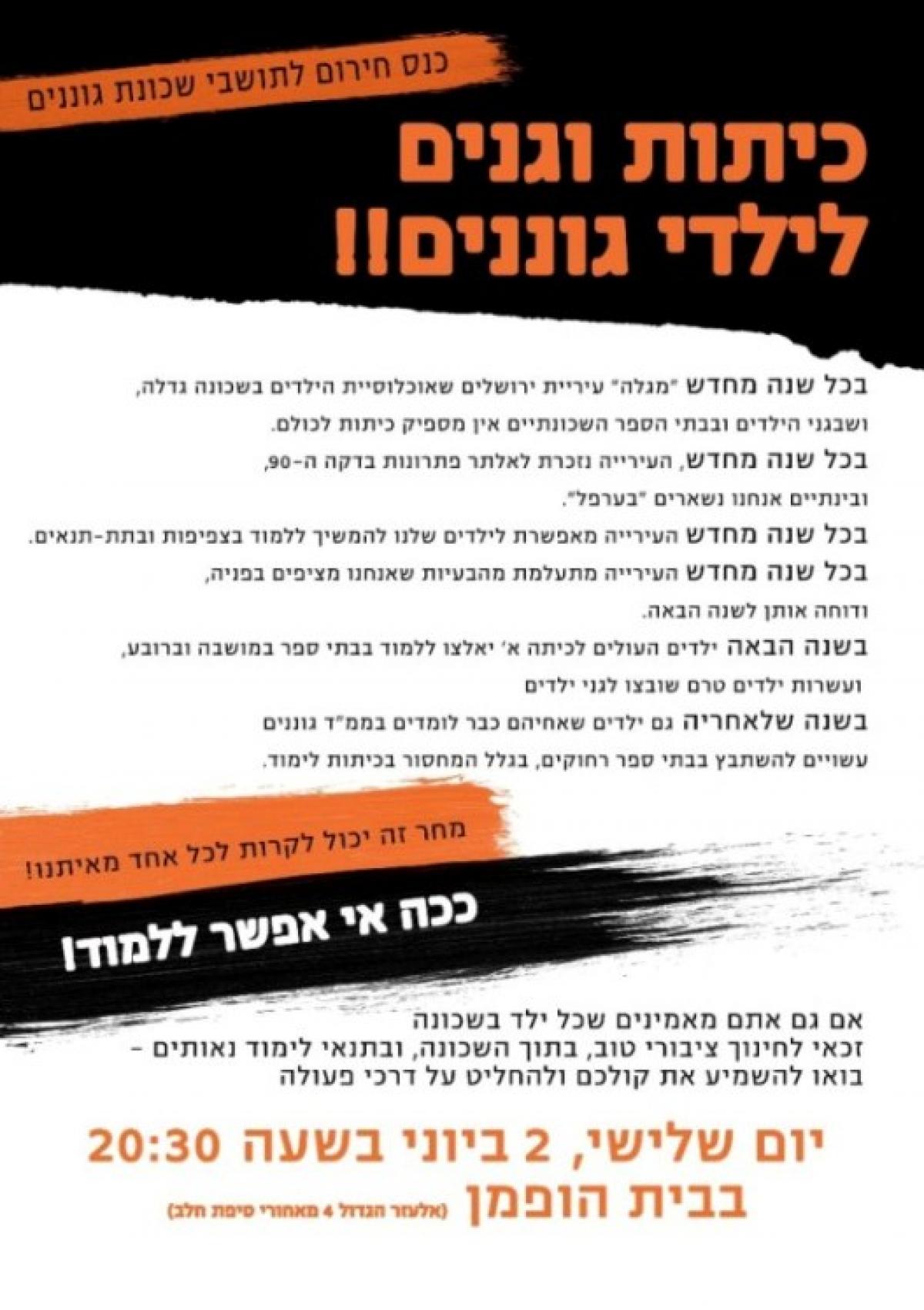 תושבי השכונה פונים לראש העיר, ניר ברקת, בדרישה כי העירייה תוודא שלכל הילדים המתגוררים בשכונה תהיה אפשרות ללמוד בגנים ובבתי ספר בתוך תחומי השכונה, ובתנאי לימוד נאותים, וכי יימצא פתרון ארוך טווח למחסור המתמיד בגנים ובכיתות לימוד, בתיאום עם תושבי השכונה.