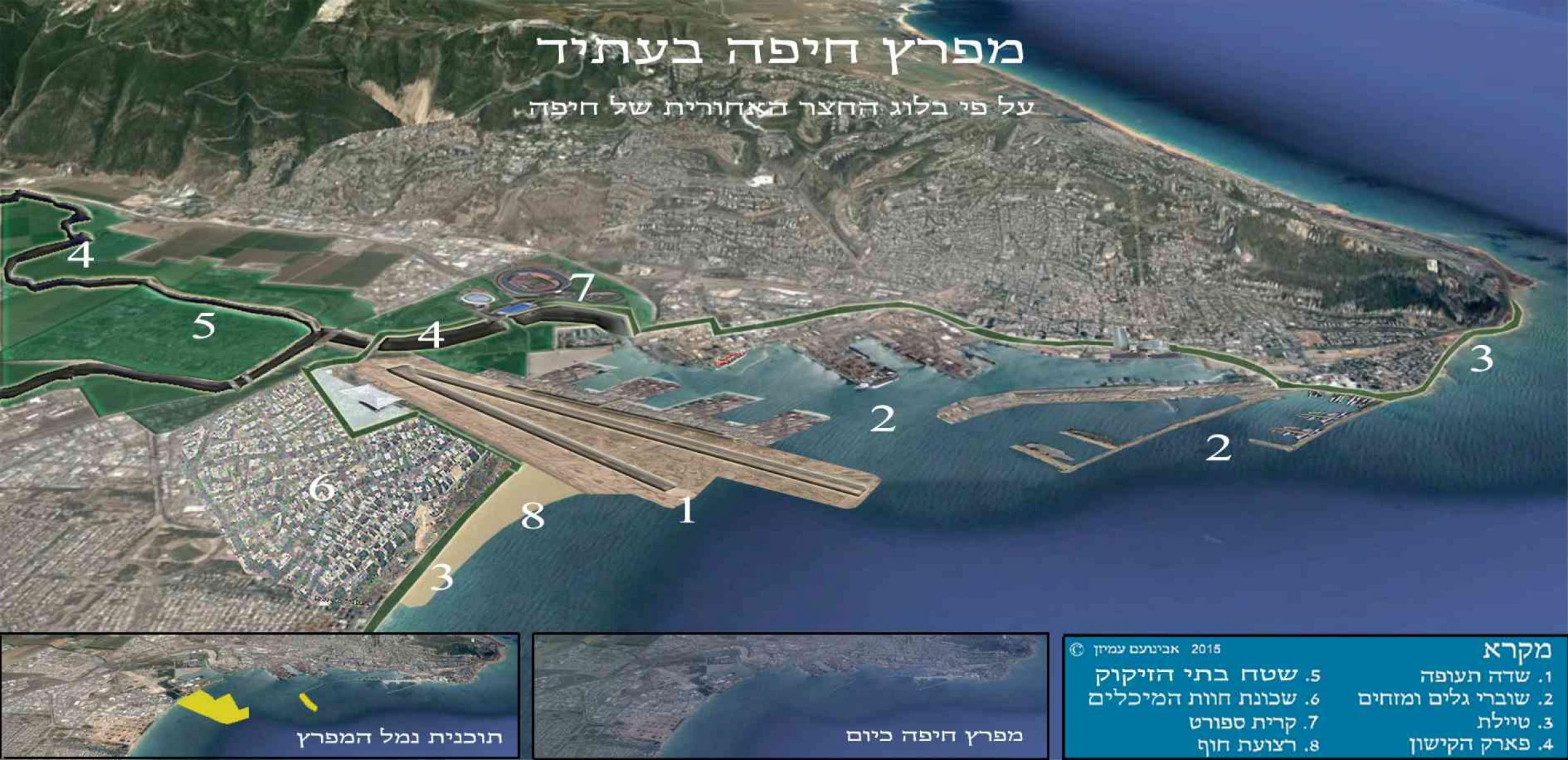 במפרץ חיפה אפשר לבנות שני מסלולי נחיתה למטוסי בואינג 747 על אותו השטח כמעט שמיועד כיום למגרשי המכולות בנמל המפרץ המתוכנן. על צידו של המסלול הארוך מהשניים אפשר יהיה להקים את רציפי נמל הספינות החדש, ובדרך זאת לא יפחת שטח נמל המפרץ אלא יגדל. נמל חיפה כולו יגדל במידה רבה באמצעות הוספת והארכת שוברי הגלים במערב הנמל.
