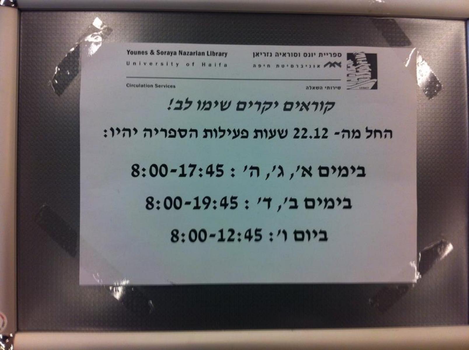 על רקע החלטת האוניברסיטה לצמצם את מספר שעות הפעילות של הספרייה, כך ששירותיה יסתיימו בשעה שש בערב, אנחנו, קבוצת סטודנטים החתומים למטה, פונים להנהלת אוניברסיטת חיפה ומבקשים הארכת שעות הפעילות עד עשר בלילה –לפחות- מהטעמים הבאים :