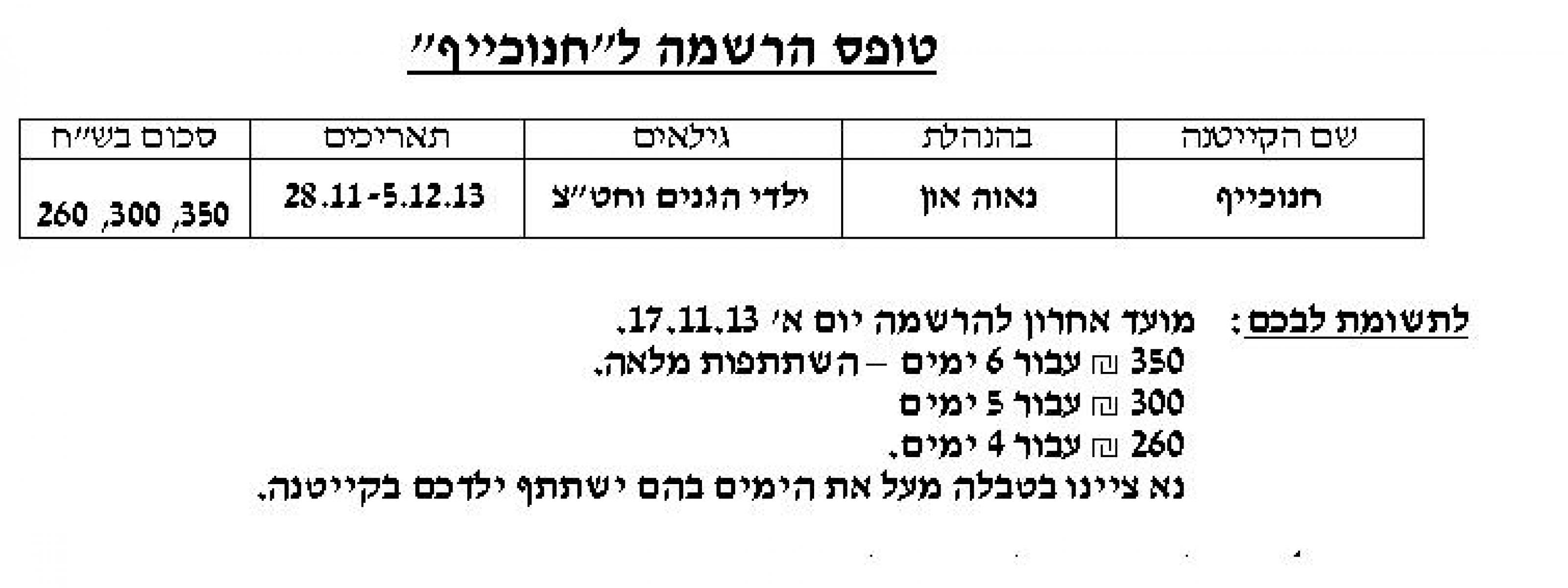 ברכות לראש עירנו הנבחר! עכשיו הגיע הזמן לפעול!חיפוש פשוט באינטרנט מראה שקייטנת חנוכה לילדי אריאל ( גם כאלה שמשלמים על צהרון) עולה 705 ש\\"ח ל-5 ימים - 121 ש\\"ח ביוםאם נחשוב על משפחות שיש להן 3 ילדים - נגיע לסכום לא הגיוני בעליל עבור תשלום לקייטנה.מצ\\"ב פרטי העלות של הקייטנה באחת הרשויות השכנות (ישוב קטן מצב סוציואקונומי דומה לשלנו)למה שם ההורים משלמים חצי מהסכום והצהרון ממשיך לפעול גם בחופשות?ראש העיר הנכבד, גב\\\' אילנה נולמן מנהלת מח\\\' חינוך, מר\\\' שלומי עמר, מנכ\\"ל חב\\\' גבנים, מר\\\' קוקי ביטון - מנכ\\"ל העירייה, מר אלי גיל-עד, מנהל מח\\\' רווחהיש לכם חודש עד לפתיחת הקייטנות, אנו דורשים הוזלת עלות הקייטנה. לא הגיוני שבישוב כמו אריאל הורים ידרשו לשלם הון עבור הקייטנה!לידיעתכם - בעלות זו ניתן לרשום את הילד לקייטנת סטארט-אפ פרטית בתל אביב.Поздравляем нового мэра! Теперь настало время действовать!Простой поиск в Интернете показывает что лагеря Хануки для детей Ариэля (даже тех, кто платит за продленку) стоит 705 шекелей в течение 5 дней - 121 шекелей в деньЕсли мы думаем о семьях , у которых трое детей - получаем явно необоснованную сумму для оплаты лагеря.Прикрепленная стоимость лагеря одного соседнего городка (маленький городок , как наш социально-экономический статус )Почему , там родители платят половину суммы и после обеда продленка продолжает работать даже во время праздников ?Господин мэр Эли Швиро, г-жа Илана Нульман - директор департамента Образование , г-н Шломи Амар , генеральный директор Гбаним, г-н Коки Биттон - сити-менеджер , г-н Эли Гил-Ад директор отдела соцобеспечения.Чтобы открыть лагерь , мы требуем снижения стоимости лагеря! Почему в городе Ариэль родители обязаны платить огромные деньги за лагерь!?Пожалуйста, обратите внимание - за эту стоимость может записать ребенка в пристижный лагерь в Тель-Авиве .