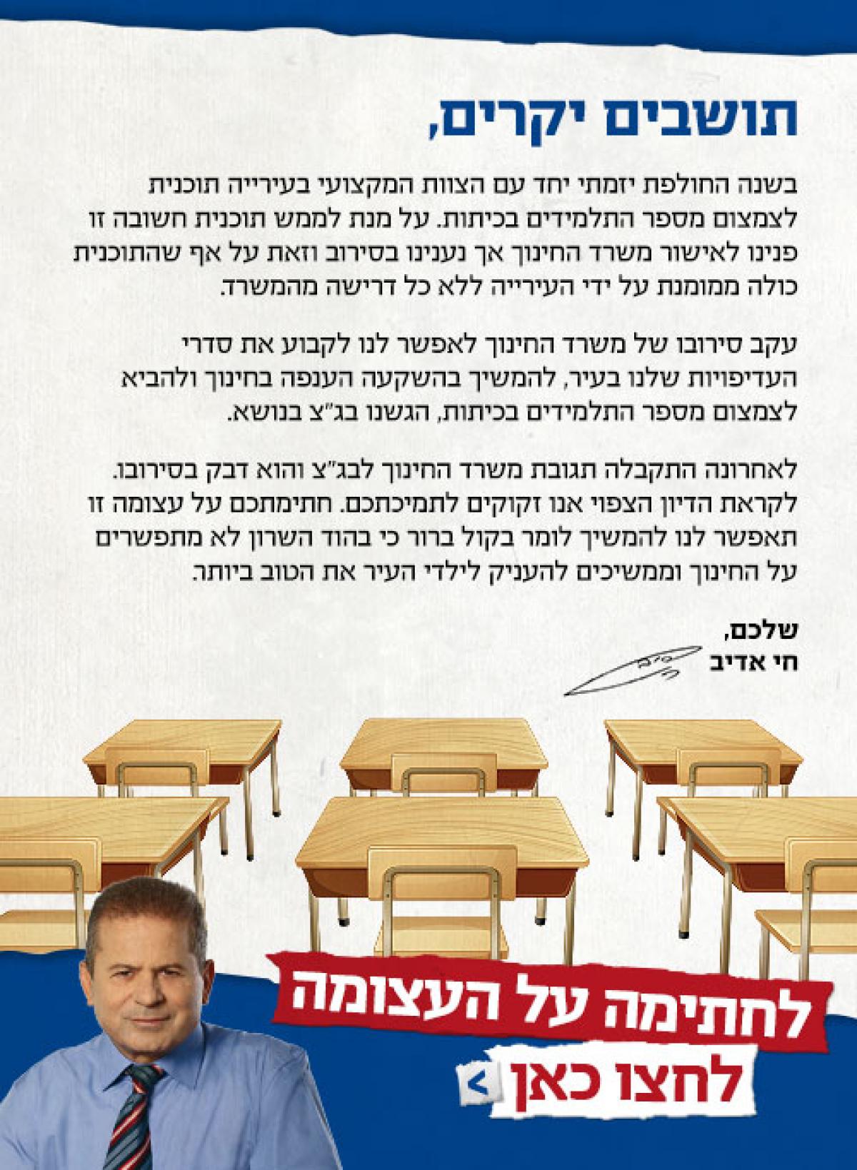 בקרוב ידון בג"צ בעתירה שלי נגד משרד החינוך לאפשר לי להוריד את מספר התלמידים בכתות במימון העירייה. הצטרפו אלי, חי אדיב ראש עיריית הוד השרון, במאבק נגד משרד החינוך ע"י חתימה על העצומה להקטנת הכתות