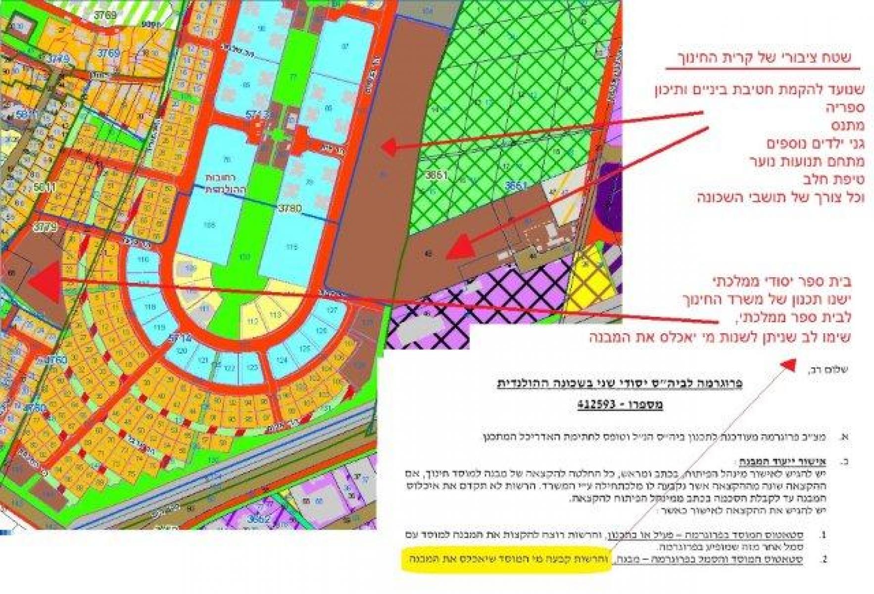 - הקמת בית ספר דתי אזורי בשכונה תהייה על חשבון הקמת בית ספר ממלכתי שתוכנן לתת מענה לצרכי הגידול הכללי בכמות הילדים בשכונה.
