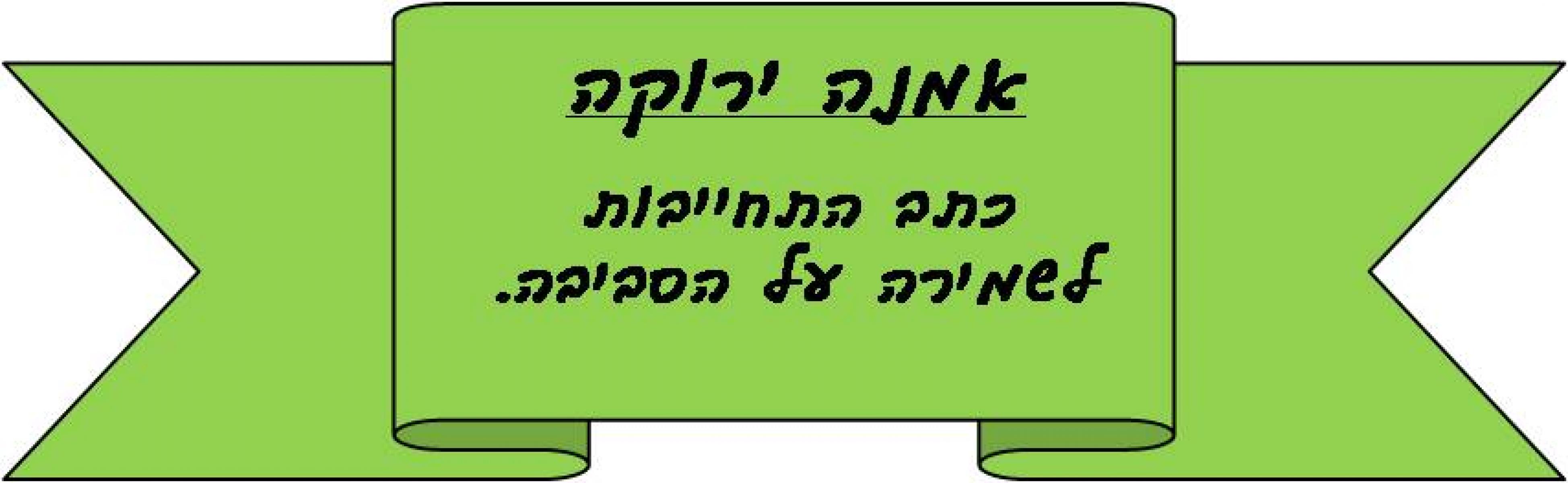 התחייבות:•נלמד את קהילת ביה"ס כיצד יש לשמור ולכבד את סביבתם, על פי ערכיי הדמוקרטיה, קיימות, כבוד, הערכה וצדק.•נפחית במקור, נשתמש שוב ונתקן.•נשמור על נקיון הסביבה.•נקפיד על צריכה נבונה, ירוקה ומוסרית.•נמחזר, נפחית ונפריד פסולת .•נשמור ונטפח את משאבי הטבע: מים, קרקע, נוף ואויר עבורנו ועבור הדורות הבאים.•נשמור על שטחים פתוחים ונצא אל הטבע.•אנו מקבלים על עצמנו לנהוג באחריות בכל עת ובכל מקום, להיות מעורבים, להשפיע ולגרום לשינוי בסביבתנו, כדי שנוכל לחיות באווירה נעימה,אקלים חיובי,בריא ומוגן בבית הספר ובקהילה.