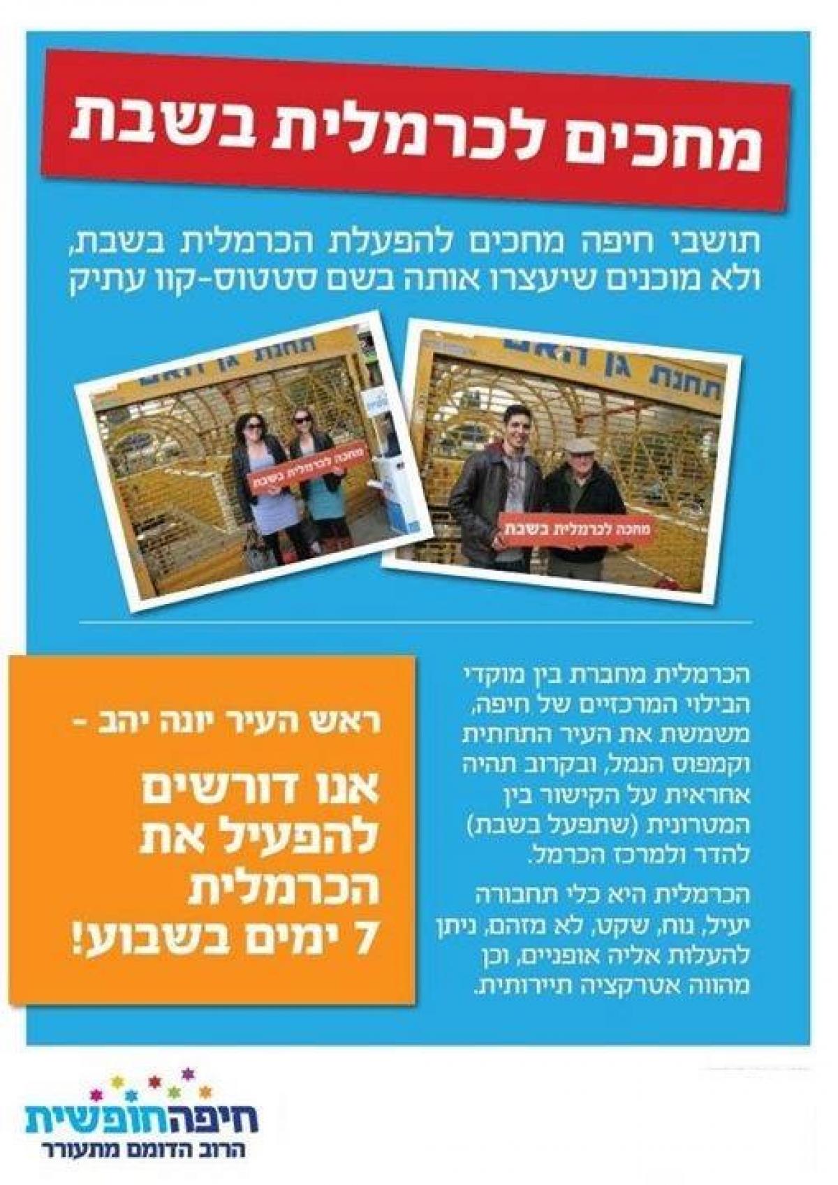 הכרמלית מחברת בין מוקדי הבילוי המרכזיים של חיפה, משמשת את העיר התחתית הקמפוס הנמל, בקרוב תהיה אחראית על הקישור בין מטרונית (שתפעיל בשבת) להדר למרכז הכרמל כרמלית היא כלית תחבורה יעיל, נוח, שקט, לא מזהם, ניתן להעלות עליה אופניים,וכן מהווה אטרקציות תיירותיות. עזרו לנו וב זכותנו ובזכותכם הכרמלית תפעל בשבת
