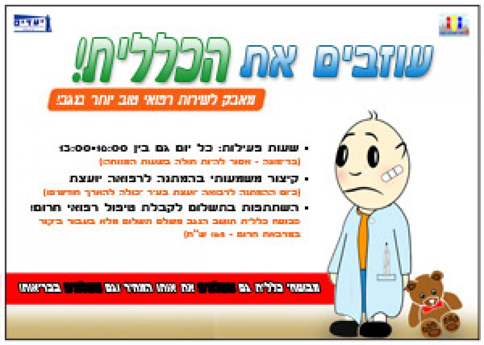 אם אתם חברי קופ"ח כללית בדימונה (ורוב הסיכויים שאתם חברים), אתם יודעים שאסור לכם להיות להיות חולים בין השעות 13:00-16:00. בשעות האלו אסור לכם גם להיות במצב חירום (לא עלינו!) בגלל שאין אפילו רופא אחד שיסכים לקבל אתכם. אם אתם חברי קופ"ח כללית בדימונה אתם יודעים שבכדי לקבל שירותי רפואה יועצת (רופא מומחה) אתם צריכים לחכות ...חודשיים או לנסוע לבאר שבע.אם אתם חברי קופ"ח כללית בדימונה אתם שייכים לקופה היחידה בדימונה שלא משתתפת בתשלום לקבלת טיפול רפואי חירום (במרכז מיראז' החדש).בקיצור אם אתם חברי קופ"ח כללית בדימונה אתם פשוט מסכנים את עצמכם! הצטרפו לפרלמנט דימונה למען מתן שירותי רפואה טובים יותר על ידי קופות החולים.
