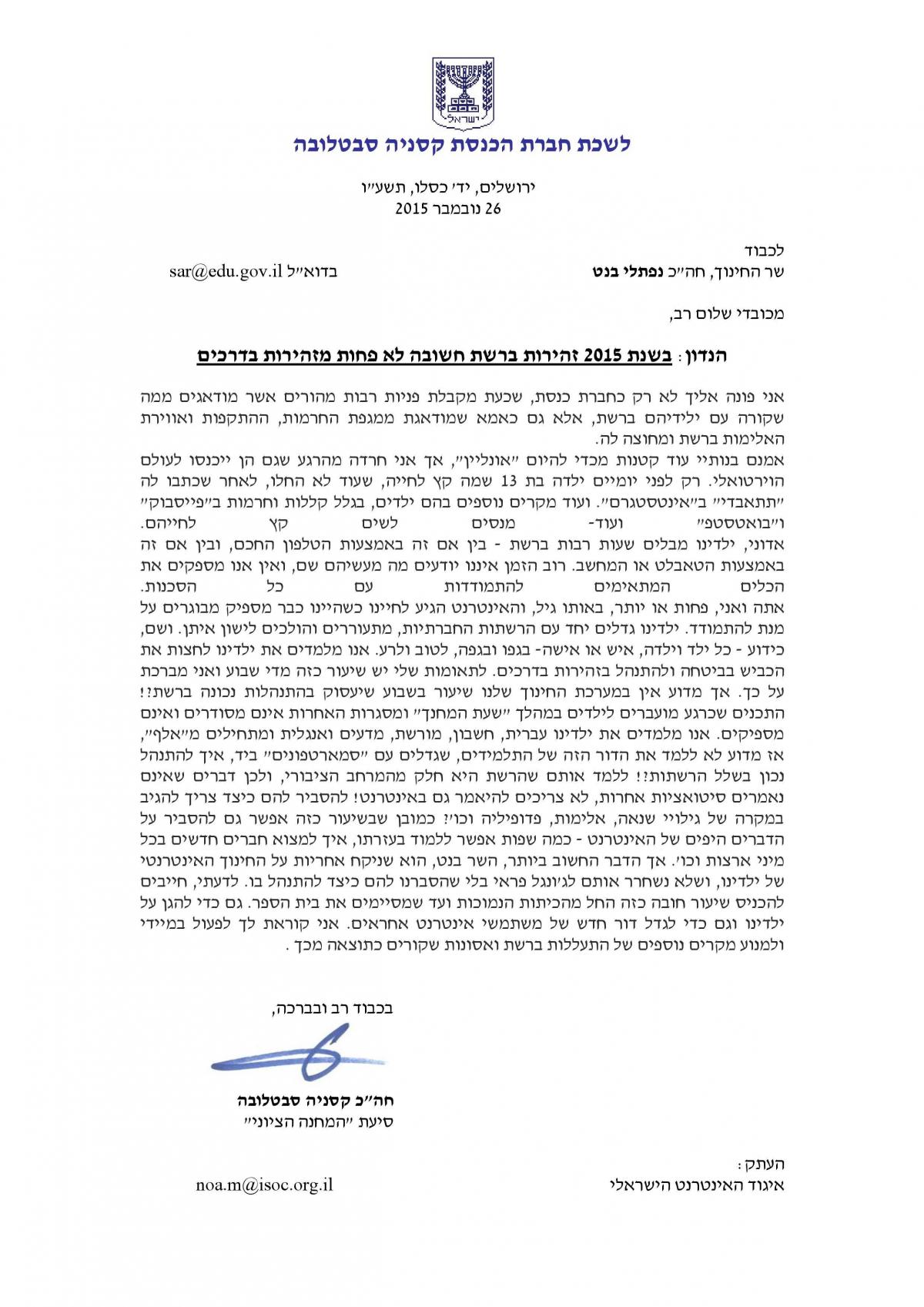 אמנם בנותיי עוד קטנות מכדי להיום "אונליין", אך אני חרדה מהרגע שגם הן ייכנסו לעולם הוירטואלי. רק לפני יומיים ילדה בת 13 שמה קץ לחייה, שעוד לא החלו, לאחר שכתבו לה "תתאבדי" ב"אינטסטגרם". ועוד מקרים נוספים בהם ילדים, בגלל קללות וחרמות ב"פייסבוק" ו"בואטסטפ" ועוד- מנסים לשים קץ לחייהם. אדוני, ילדינו מבלים שעות רבות ברשת - בין אם זה באמצעות הטלפון החכם, ובין אם זה באמצעות הטאבלט או המחשב. רוב הזמן איננו יודעים מה מעשיהם שם, ואין אנו מספקים את הכלים המתאימים להתמודדות עם כל הסכנות. אתה ואני, פחות או יותר, באותו גיל, והאינטרנט הגיע לחיינו כשהיינו כבר מספיק מבוגרים על מנת להתמודד. ילדינו גדלים יחד עם הרשתות החברתיות, מתעוררים והולכים לישון איתן. ושם, כידוע - כל ילד וילדה, איש או אישה- בגפו ובגפה, לטוב ולרע. אנו מלמדים את ילדינו לחצות את הכביש בביטחה ולהתנהל בזהירות בדרכים. לתאומות שלי יש שיעור כזה מדי שבוע ואני מברכת על כך. אך מדוע אין במערכת החינוך שלנו שיעור בשבוע שיעסוק בהתנהלות נכונה ברשת?! התכנים שכרגע מועברים לילדים במהלך "שעת המחנך" ומסגרות האחרות אינם מסודרים ואינם מספיקים. אנו מלמדים את ילדינו עברית, חשבון, מורשת, מדעים ואנגלית ומתחילים מ"אלף", אז מדוע לא ללמד את הדור הזה של התלמידים, שגדלים עם "סמארטפונים" ביד, איך להתנהל נכון בשלל הרשתות?! ללמד אותם שהרשת היא חלק מהמרחב הציבורי, ולכן דברים שאינם נאמרים סיטואציות אחרות, לא צריכים להיאמר גם באינטרנט! להסביר להם כיצד צריך להגיב במקרה של גילויי שנאה, אלימות, פדופיליה וכו'? כמובן שבשיעור כזה אפשר גם להסביר על הדברים היפים של האינטרנט - כמה שפות אפשר ללמוד בעזרתו, איך למצוא חברים חדשים בכל מיני ארצות וכו'. אך הדבר החשוב ביותר, השר בנט, הוא שניקח אחריות על החינוך האינטרנטי של ילדינו, ושלא נשחרר אותם לג'ונגל פראי בלי שהסברנו להם כיצד להתנהל בו. לדעתי, חייבים להכניס שיעור חובה כזה החל מהכיתות הנמוכות ועד שמסיימים את בית הספר. גם כדי להגן על ילדינו וגם כדי לגדל דור חדש של משתמשי אינטרנט אחראים. אני קוראת לך לפעול במיידי ולמנוע מקרים נוספים של התעללות ברשת ואסונות שקורים כתוצאה מכך.