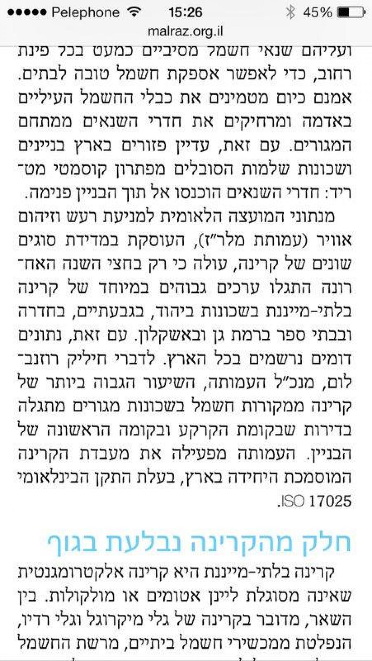 במאמר בו צוטטה חברת מלר"ז, החברה שביצעה את המדידות, פורסם, כי בעירינו נתגלו קרינות חריגות.