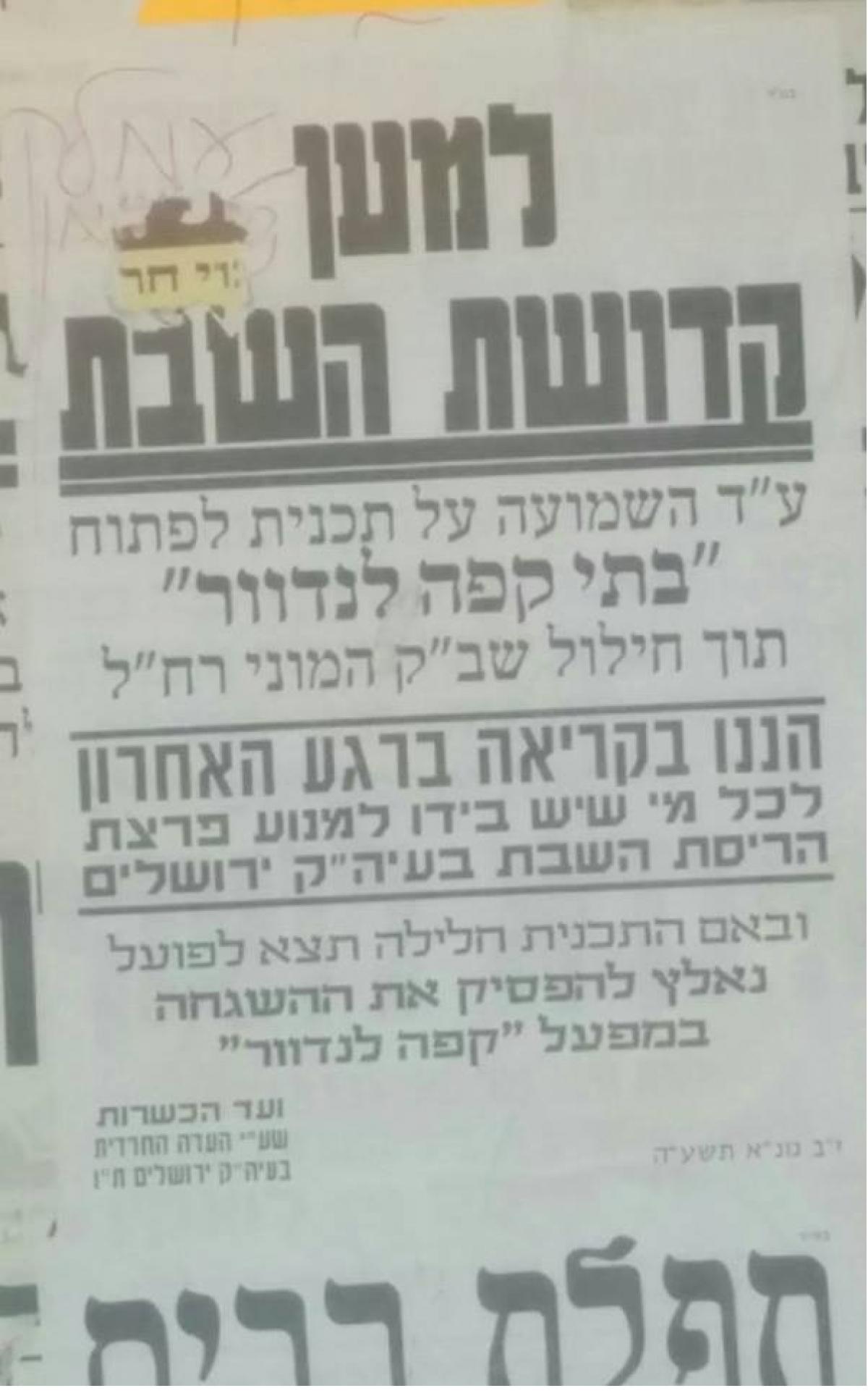 אזרחי ישראל, שוב אנחנו נתקלים במקרה של מאפיה קנאית המאיימת על חרותנו. קפה לנדוור קיבל לידיו את המבנה בגן העצמאות המיועד לבית קפה. המנהלים הצהירו שבכוונתם להפעיל את בית הקפה גם בשבתות כדי לאפשר לציבור החילוני ליהנות ולבלות ביום החופשי שלו.