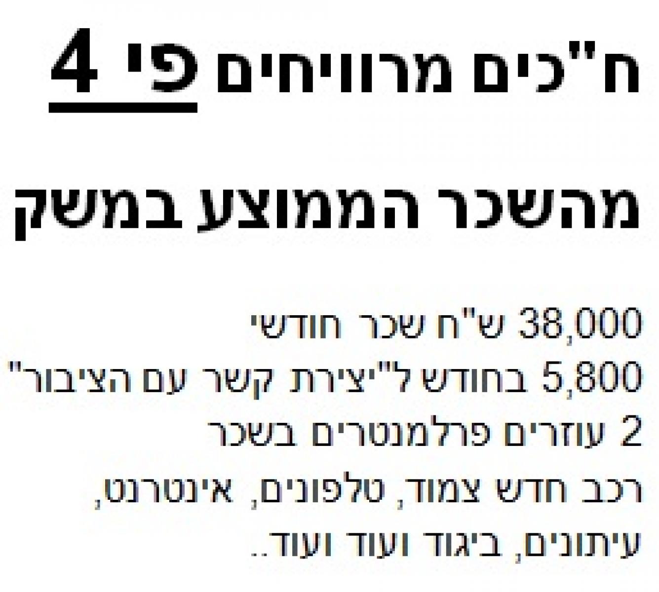 השכר הממוצע במשק הוא כרבע משכר של ח"כ.
