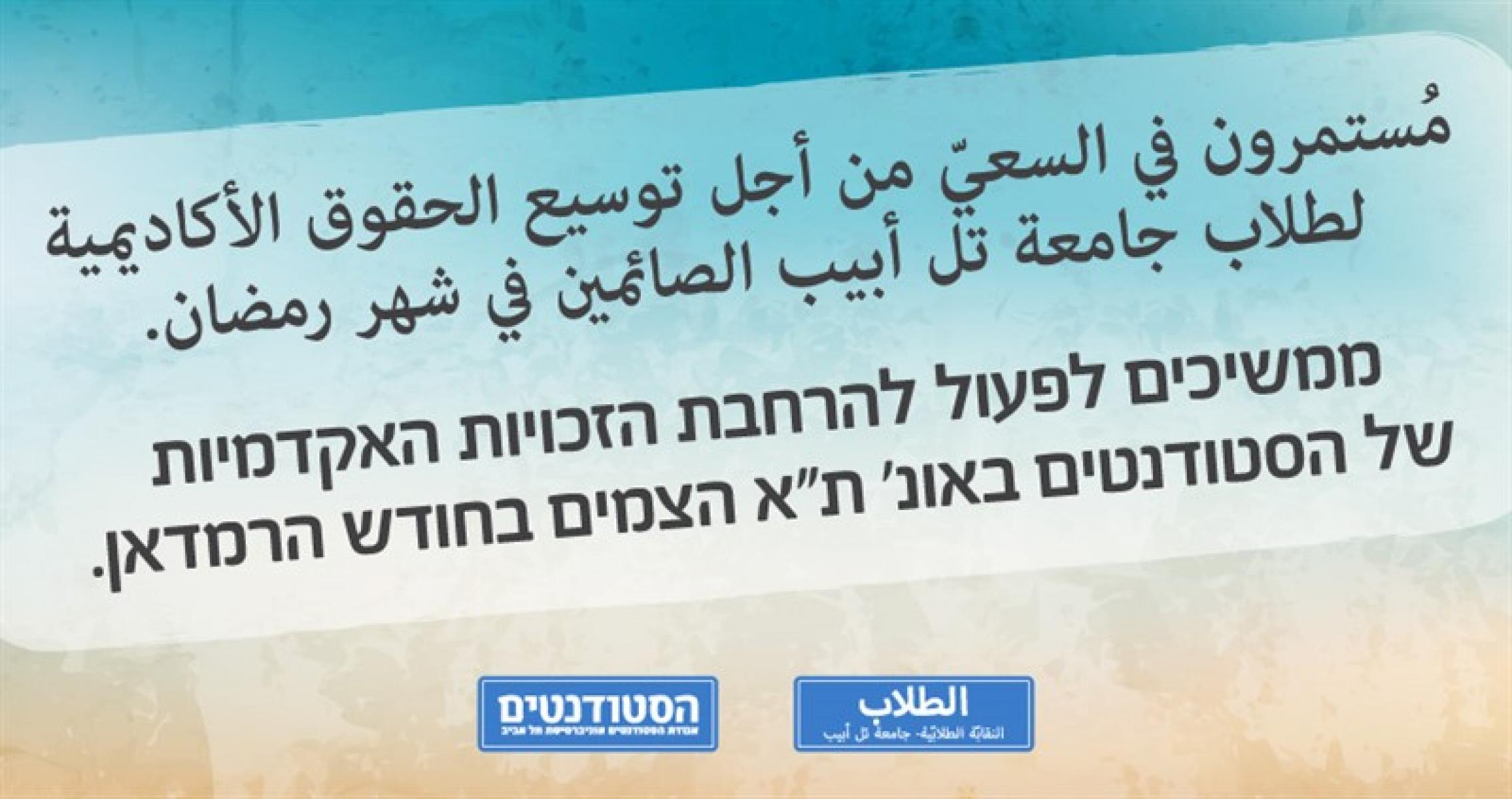 ממשיכים לפעול להרחבת הזכויות האקדמיות של סטודנטים באונ' ת"א הצמים בחודש הרמדאן.