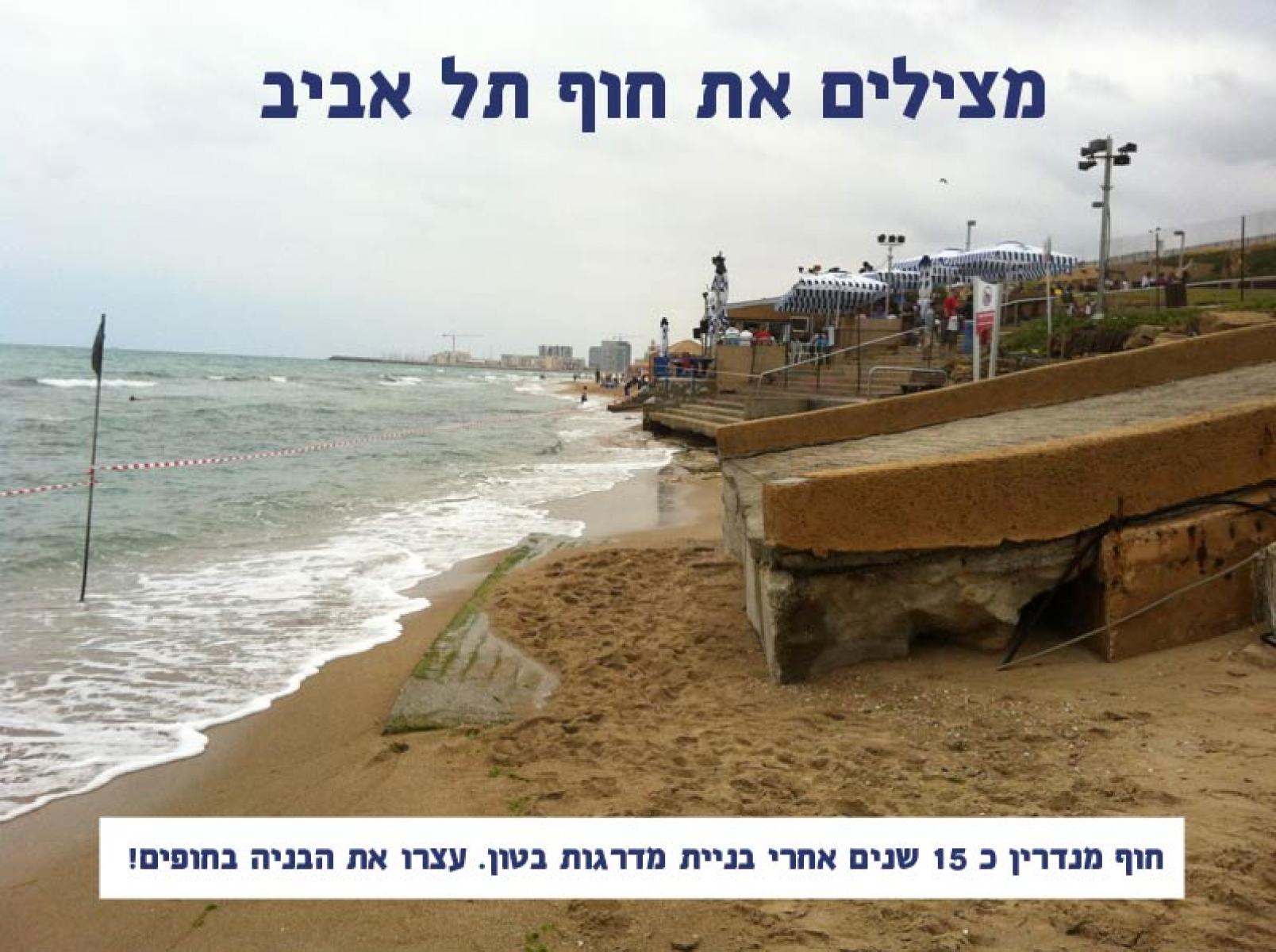 חופי תל אביב זקוקים לעזרתנו הדחופה! בדצמבר האחרון הגיעו דחפורים של עיריית תל אביב לחופי גורדון ופרישמן באישון לילה, והחלו לחפור ולסלק את החול. זאת במטרה להוסיף לטיילת טריבונות ברוחב של כ-5 מטרים ומסלול בטון ברוחב 3 מטר (סה"כ כשמונה מטרים) - הכל על חשבון החול. עיריית תל אביב מתכננת להרחיב את הטיילת לכל אורך החוף - מהמרינה עד לדולפינריום, ולצמצם את רצועת החוף הצרה ממילא על ידי כיסוי החול בבטון ובמדרגות מעץ. מדובר בהשקעה אסטרונומית של 150,000,000 ש"ח!