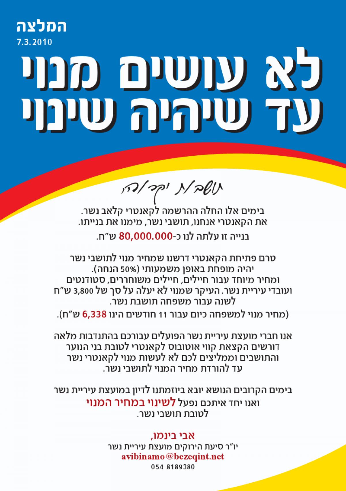 (מחיר מינוי משפחתי כיום לשנה עומד על סך 6,338 ש"ח)כאמור, בפועל אין כך הם פני הדברים, אם ברצונכם לשנות את המצה הקיים אנו חיתמו על עצומה זו.