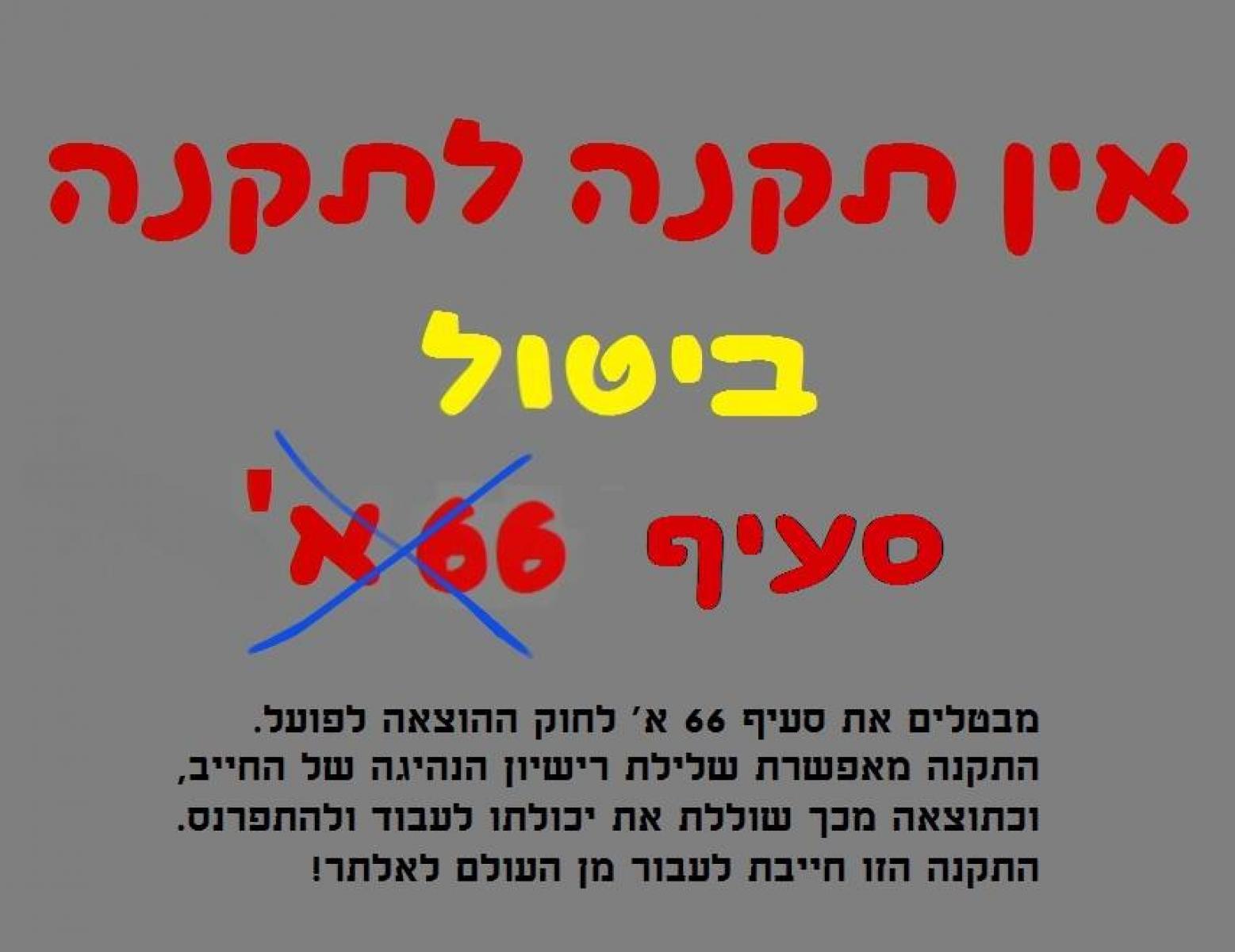 - סעיף 66א' הנו סעיף המתיר להוצאה לפועל את עיכוב חידוש רישיונו ואף שלילת רישיונו של חייב בהוצאה לפועל.סעיף זה הנו נעלם בעבור רוב אזרחי מדינת ישראל שאינם מודעים לקיומו ומאפשר להוצאה לפועל את הגבלת רשיון הנהיגה של החייב בהוצאה לפועל.הסעיף מופעל כנגד כלל החייבים ברוב סוגי החוב(רשויות מקומיות, דוחות תנועה וחניה,חברות תקשורת, רשות השידור וכו') ללא התראה מוקדמת מצד ההוצאה לפועל ובכך נוצר מצב של אזרחים הנוהגים ללא רשיון נהיגה תקף-מבלי ידיעתם, על כל ההשלכות הנובעות מכך.והחמור מכל: בסעיף עצמו נכתב כי לא יילקח הרישיון מנהגים מקצועיים שפרנסתם עליו, למרות זאת, עושה זאת ההוצאה לפועל באופן עקבי, ובכך היא למעשה מפקיעה את פרנסתו של החייב כעונש אכזר על היותו בעל חוב, ולא מפרידה בין החייבים כמצוין בחוק מפורשות.מעשה זה הנו גם אבסורד מוחלט: "חובות צריך לשלם" הצהיר פעם מר דוד מדיוני-ראש ההוצאה לפועל...אך איך ישלם אותו חייב את חובו אם פרנסתו נלקחה ממנו?בששת החודשים האחרונים הציתו עצמם 5 אנשים למוות עקב מצבם הכלכלי.שלושה מהם אחזו ברשיון מקצועי (2 נהגי משאיות ומפעיל ציוד מכני) שכשנלקח מהם, חרב עליהם עולמם... חייבים לעצור את סעיף 66א' !!!לדף המאבק: https://www.facebook.com/events/637727712954260/?source=1
