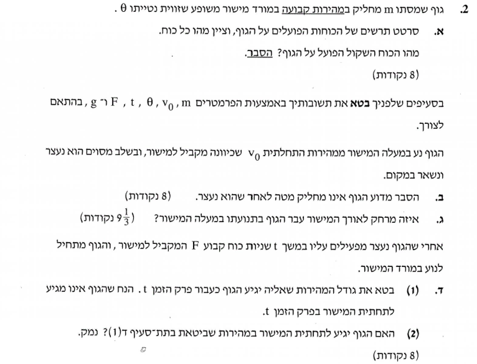 @@@@@@העצומה נסגרה! הגענו ל1000 חתימות!!!!! תודה רבה לכל מי שהצביע, אני מקווה שהאחראים לבגרות בפיזיקה יבינו שהם עשו טעות בשאלה ושלא יפגע לנו הציון @@@@@@@עריכה=כל הכבוד הגענו למטרה! 1000 חתימות! משרד החינוך, האחראים לבגרות, תראו 1000 תלמידי פיזיקה מתולננים על שאלה 2 שהייתה בבגרות, אנחנו מחכים לתגובתכם הרשמית.אני חושב שאם 100 תלמידי פיזיקה מתולננים על שאלה אחת ספציפית זה אומר דרשני!!!!!!!!! בתאריך 3/7/2012אנחנו תלמידי פיזיקה עשינו בגרות במכניקה, אני לא מתולנן על הבגרות בכלליות מכיוון שהבגרות הייתה הוגנת מאוד! אולם הייתה בעיה בשאלה 2 אשר הייתה בבגרות, הניסוח של השאלה היה ממש לא טוב, הרבה מאוד תלמידים לא הבינו האם יש חיכוך או איין חיכוך.בסעיף א' התלמיד היה אמור להבין שיש חיכוך על מנת שהמערכת תישאר במנוחה לפי החוק הראשון של ניוטון. וסעיף א' היה סעיף בסדר.אולם בהמשך השאלה לא כתוב האם החיכוך ממשיך להתקיים או לא. לא היה כתוב האם המשטח חלק או בעל חיכוך, למי שראה או יראה את השאלה יבחין שהיינו צריכים לבטא את המרחק ואת מהירות הגוף על ידי פרמטרים, אולם לא היה שום זכר לפרמטר עם חיכוך, דבר אשר היערר את מחשבתו של התלמיד עוד יותר. כמו כן, היה מאוד קשה להבין אם יש קשר בין הסעיפים השונים. בקיצור, כותב כאן תלמיד שהוגש על 99 לבגרות, רמתי מאוד טובה ואני סבור שקיבלתי גם את כל הנקודות ב2 השאלות האחרות אשר בחרתי, אולם שאלה 2 הייתה קאטסטרופה. לכן אנחנו תלמידי פיזיקה דורשים תוספת ציון לאלה שעשו את שאלה 2 בבחינה ולאלה שגם לא עשו אותה. השאלה הייתה מאוד מבלבלת ולא חד משמעית.כמו כן, התלמידים שלא עשו את שאלה 2 גם נפגעו מכייון שאלה שניסו לפתור את השאלה , ביזבזו הרבה מאוד זמן על השאלה.ובנוסף הבחירה הפכה להיות בחירה של 3/4 במקום 3/5.לכן צריך לעלות לכולם את הציון.נ.ב אתם יכולים לראות את שאלה 2 על ידי לחיצה על התמונה בצד ימין למעלה.אלא שיש להם חברים שלומדים פיזיקיה אשר חושבים כמוני, תפרסמו את זה לחברים שלכם, דרך הפייסבוק.תודה רבה!עריכה, תוספת-בית ספר יואל גבע פירסם בעמוד הפייסבוק שלו הודעה בנוגע לבגרות בפיזיקה:"התייחסות לשאלון הבחינה במכניקה (בגרות בפיזיקה)- קיץ 2012: אמיר דוד וברק ברבי, מורי פיזיקה ביואל גבע: "ברמה הכללית, השאלות היו בתחום החומר הנלמד, על פי תכנית הלימודים. יוצאי דופן בבחינה: שאלה 1- הסעיף האחרון עוסק בנושא כבידה, שלא כמקובל. שאלה 2- ניסוח השאלה היה מעט מבלבל. מהניסוח של השאלה לא ברור הקשר בין הסיטואציות השונות. בסעיף ג' של אותה שאלה, לא הייתה התייחסות לכך שיש להיעזר בסעיף א'. העדר שרטוטים, כמקובל בשאלות כאלה, הקשה גם הוא על הנבחנים. מלבד אלה, שאלות 3,4,5 הן שאלות מובנות, מנוסחות היטב, ללא סטייה ממסורת הבחינה. בחירה נבונה אפשרה לנבחנים להגיע לציון מקסימלי.""קרדיט ליואל גבע- מעמוד הפייסבוק שלו.כלומר 2 מורי פיזיקה חושבים כמו התלמידים, בנוסף גם 2 המורים בבית הספר שלי חשבו ככה. כלומר כבר 4 מורים שנגד שאלה 2.--------------------------------------------------------------------------------------------------------