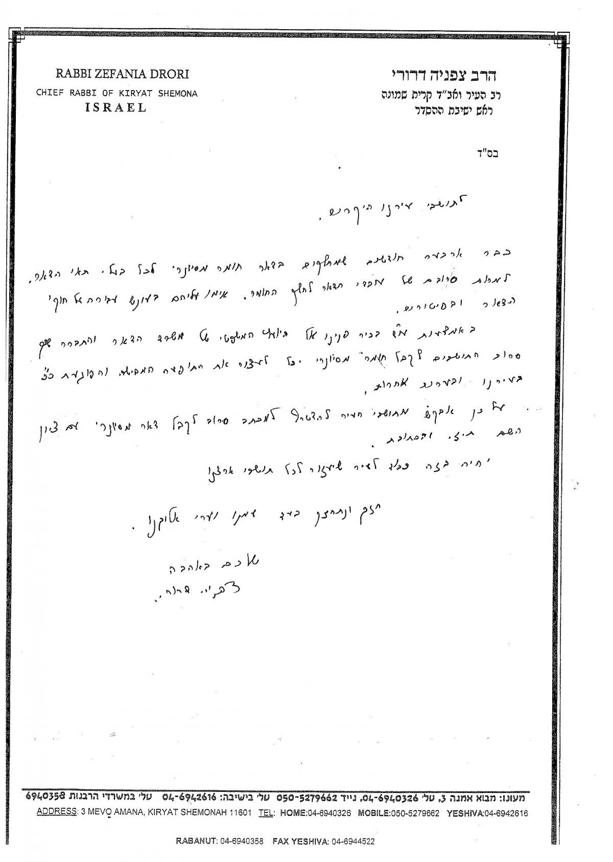 תושבי קרית שמונה שלום.מצורף מכתב בכתב ידו של מו"ר הרב צפניה דרורי רב העיר ותוכלו לקרוא את הדברים הבאים במכתבו:"לתושבי עירנו היקרים,כבר ארבעה חודשים שמחלקים בדואר חומר מסיונרי לכל בעלי תאי הדואר, למרות סירובם של עובדי הדואר לחלק החומר. איימו עליהם בעונש עבירה על חוקי הדואר ובפיטורים.באמצעות עו"ד בכיר פנינו אל היועץ המשפטי של משרד הדואר והתברר שרק סרוב התושבים לקבל חומר מסיונרי יכול לעצור את התופעה המבישה והפוגעת כ"כ בעירנו ובערים אחרות.על כן אבקש מתושבי העיר להצטרף למכתב סרוב לקבל דואר מסיונרי עם ציון השם, ת.ז., והכתובת.יהיה בזה כבוד לעיר שיעזור לכל תושבי ארצנוחזק ונתחזק בעד עמנו וערי אלוקינו,שלכם באהבהצפניה דרורי."מה צריך לעשות? פשוט מאוד!כל משפחה חותמת את שם אבי\אם המשפחה, עם מספר תעודת הזהות שלו\ה, ובתיבת 'יישוב' לרשום את הכתובת המצויינת בדואר, בתוך קרית שמונה.ברגע שנגיע ל200 משפחות החתומות כאן על כך שאינן מעוניינות לקבל דואר מיסיונרי, נגיש את העצומה למשרד הדואר והם ייאלצו להפסיק את משלוח הדואר המיסיונרי לכל תושבי קרית שמונה!בהצלחה לכולם,לפרטים ניתן לפנות למשרדי הישיבה או למשרד הרב במועצה הדתית.
