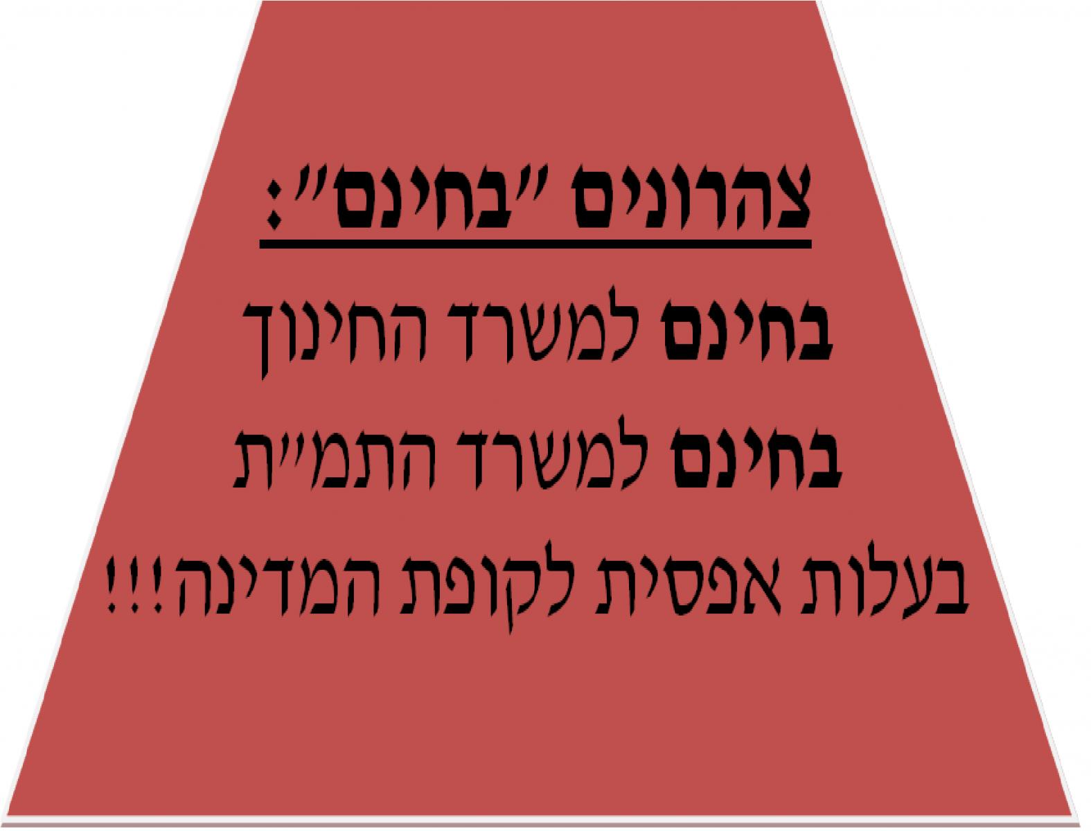צהרונים בחינם?!למי?לממשלה!כבר חודשים - מתחילת שנת הלימודים תשע"ג מערכת הצהרונים "בחינם" עדיין לא הוקמה במשרד החינוך,וכיאה למדינת חלם וחכמיה - במקום להשאיר בינתיים עד שגלגלי הבירוקרטיה יואילו בטובם לנוע את הצהרונים באחריות משרד התמ"ת, ביטלו קודם כל אחריות זו - ואנו הנשים האמהות העובדות נשארנו קרחות מכאן ומכאן...ילדינו סובלים מהזנחה, אנחנו מאשמה, ומשק הבית מהוצאת כספים מטורפת בחודשים האחרונים - לעומת התשלום המסובסד לצהרונים כשהיו תחת התמ"ת - והעוול זועק לשמים!!!שתקנו ושתקנו, הושלנו שהנה זה מתחיל, והגענו כבר לסוף דצמבר...!עד מתי?אנא עזרו לנו להשיג את יעדינו בפנייה מרכוזת לממשלה.ניתן בינתיים לפנות עצמאית לכל הגורמים הרלוונטיים:משרד ראה"מ - ראה"מ בנימין נתניהומשרד החינוך - שר החינוך גדעון סערמשרד מבקר המדינה - תלונות הציבורחברי כנסת מכל מפלגות הממשלהרשויות עירוניותמנהלי מוסדות חינוךאנשי תקשורתועוד.הצטרפו והפיצו עוד היום!כי אנחנו כאן בשבילנו.המחאה אינה פוליטית, פרקטית בלבד!